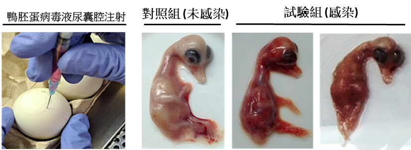 MD-iPSC產製水禽小病毒之胚半數感染量(EID50)效價測試。水禽小病毒抗體陰性之番鴨胚蛋尿囊腔注射水禽小病毒,受感染胚胎死亡並伴有全身出血情形。