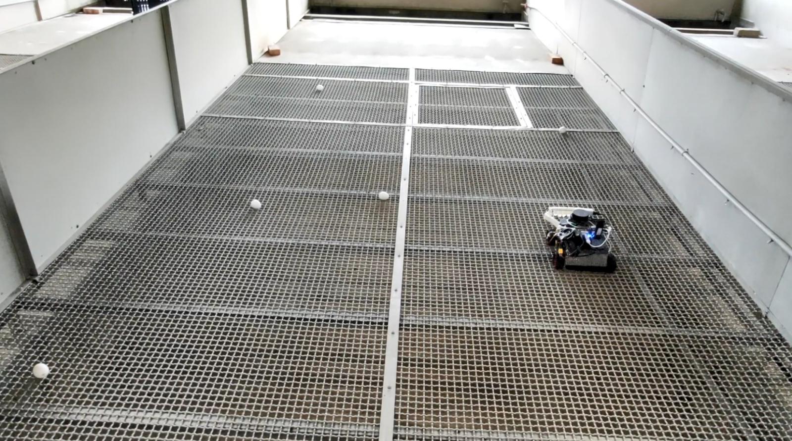 圖1. 平飼蛋鴨行為辨識研究用於建立洗浴等動物行為福利指標。 圖2. 智動化撿蛋機器人可自主巡檢鴨舍並撿拾地面蛋。