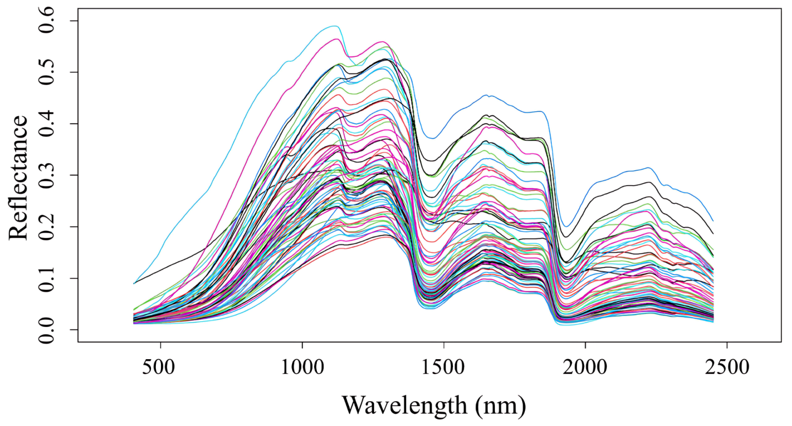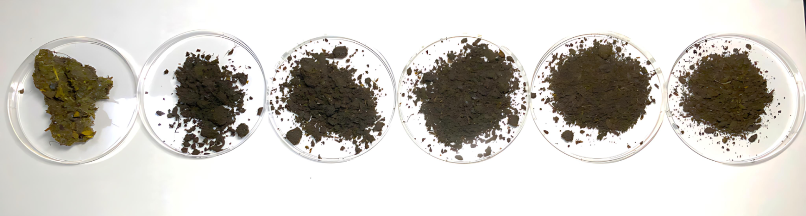 不同腐熟度的雞糞肥樣品,樣品越往右腐熟天數越久,其質地越鬆散,顏色呈現棕褐色。 Vis-NIR 可快速掃描雞糞肥樣品獲得光譜訊號 圖3.Vis-NIR光譜訊號,在特定波長可反映出與腐熟度相關的特殊官能基訊號